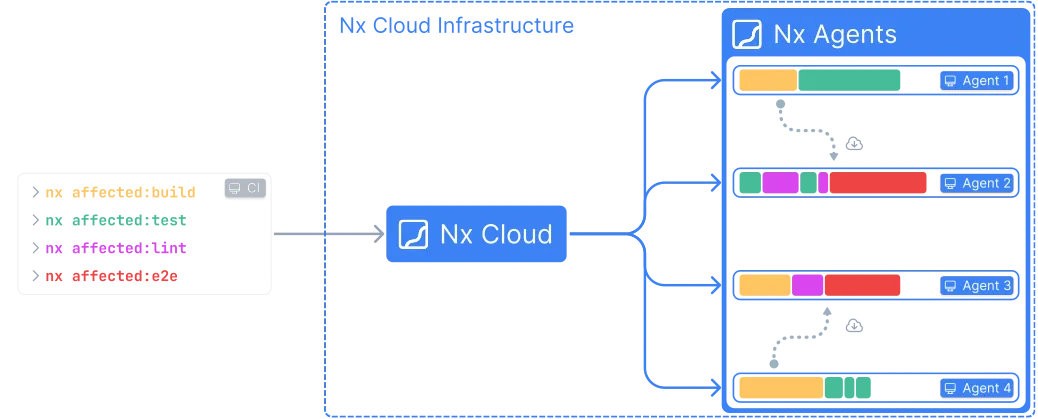 When using Nx Agents, distributing tasks across multiple machines becomes as simple as running those tasks on your local machine. This is because any task artifacts will automatically be copied to the agent machines where they are needed.