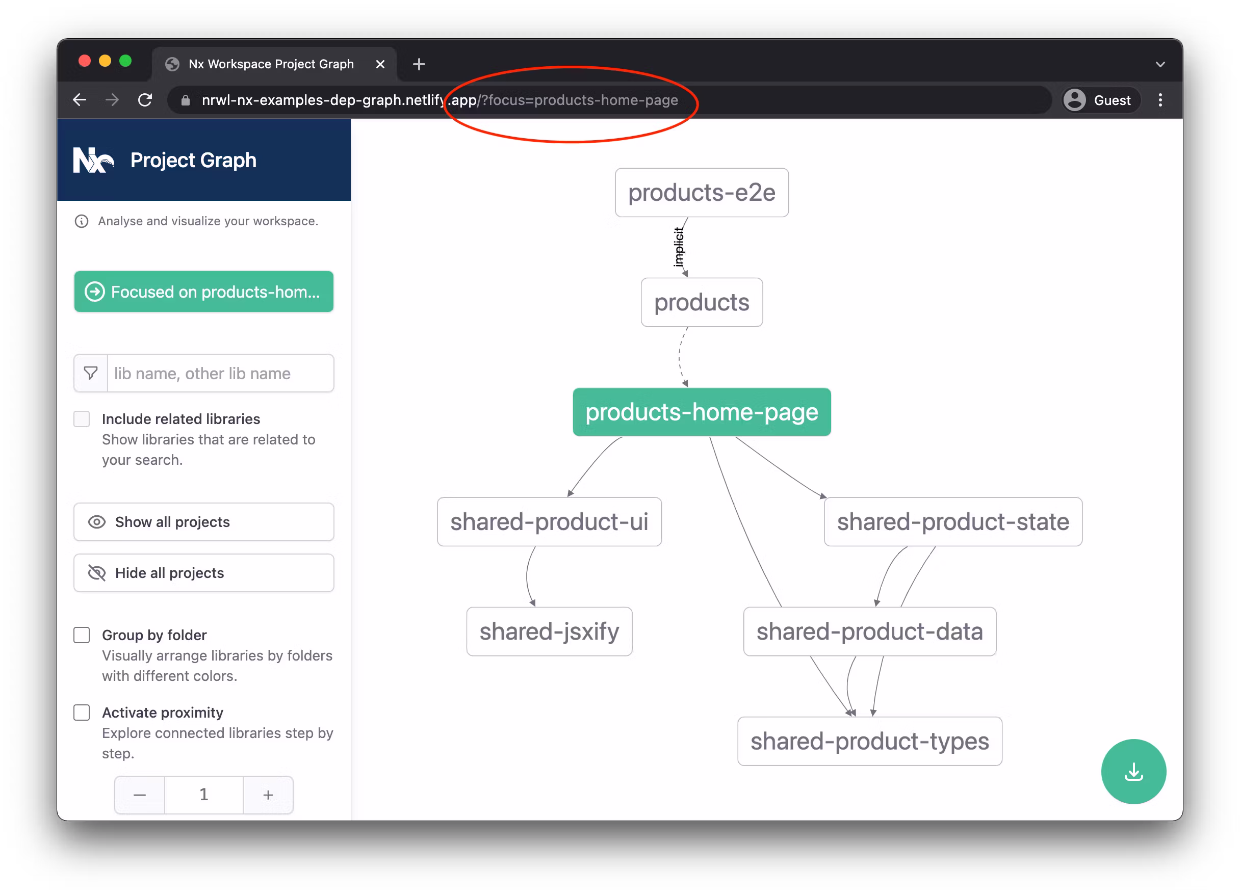 Here's our deployed live example of the above screenshot: https://nrwl-nx-examples-dep-graph.netlify.app/?focus=products-home-page